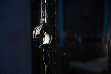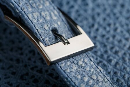 Lock and buckle close-up, elements of a blue backpack made of genuine leather on a dark background, handmade. Macro