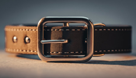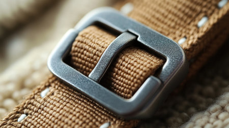 This image showcases a close-up view of a brown fabric strap featuring a metallic buckle, highlighting intricate details and textures in fashion accessories.