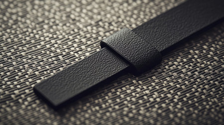 This image captures a black fabric strap resting on a textured gray surface, showcasing modern design themes with soft lighting and artistic composition.