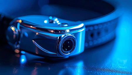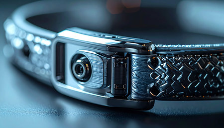 In a cool, blue-lit environment, a sophisticated metallic connector for a piece of advanced wearable technology gleams. This macro shot highlights the intricate details of the data and power port, symbolizing innovation, connectivity, and the future of personal gadgets.
