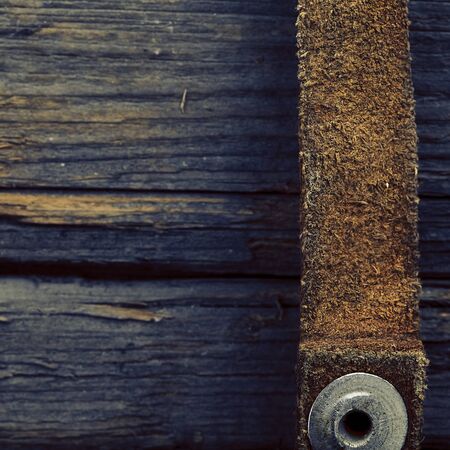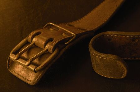 Cracked very old leather belt with a double metal buckle. Close-up of a wide dirty belt or collar on a dark table. Collectibles vintage clothing accessories. Selective focus.
