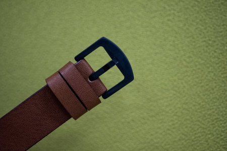 Men's leather belt with a metal buckle, close-up.