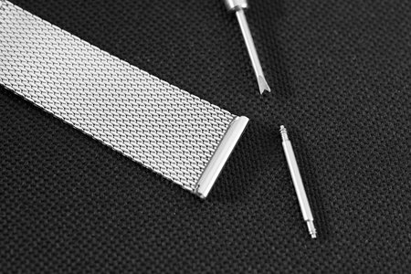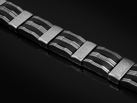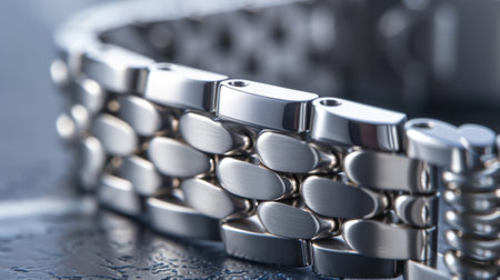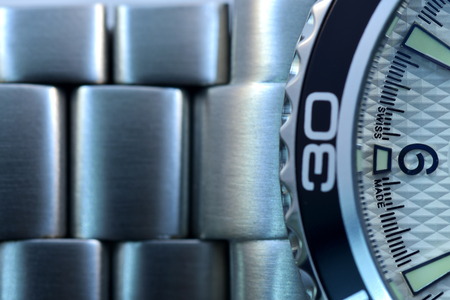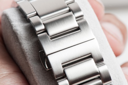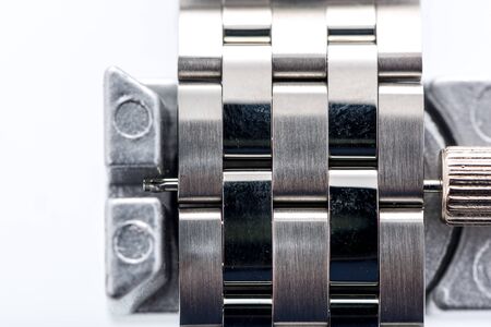 Macro closeup on links of stainless steel watch metal band