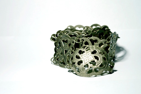 Isolate photo of ancient silver belt on white background with space for write wording, value woman accessories of Thai old generation woman more than 50 years ago. Beautiful unique style handcraft