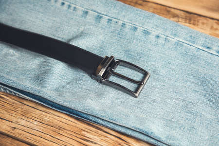 belt on jeans on the wooden background