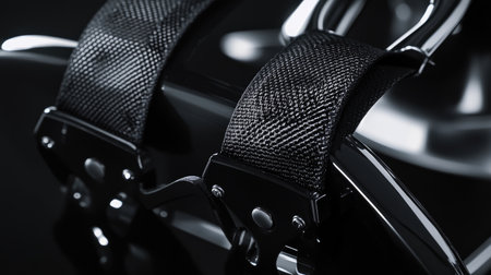 A detailed close-up image of black straps on a shiny reflective surface, showcasing texture and design elements ideal for various creative projects.