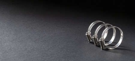 Metal hose clamp on black background. Empty space for text