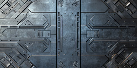 High-tech industrial metal panel background with riveted plates, brushed steel surfaces, and futuristic engraved details. The clean yet rugged aesthetic gives a professional, heavy-duty appearance for mechanical or sci-fi themes.