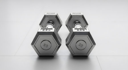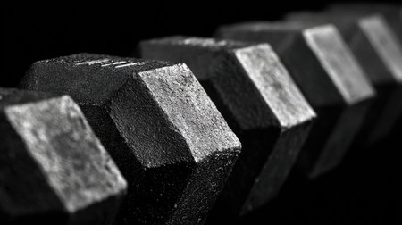 A captivating close-up of heavy cast iron dumbbells showcases their rugged texture and sheen against a dark background, ideal for fitness and health themes.