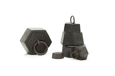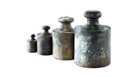 Old rustic metal weights on white background.