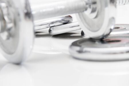 Closeup image of chrome dumbbells in modern gym