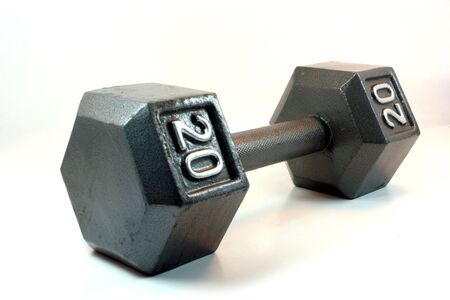 Twenty-pound dumbbell on floor. Gray dumbbell with engraved 20 on it. Weights for working out at home or in a gym.