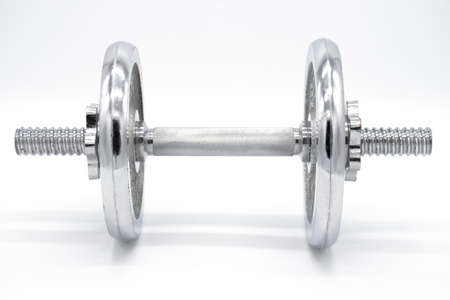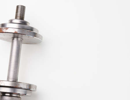 metal dumbbell with typesetting circles on a white background, sports equipment