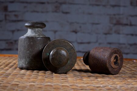 Old metal weights on a dark background. Selective focus. Toned.