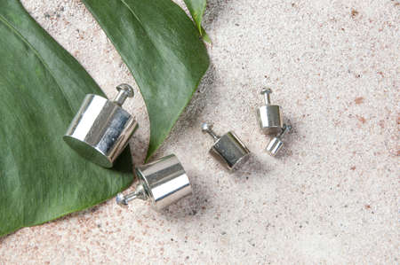 Two small metal weights for scales lie on a green agave against a green background