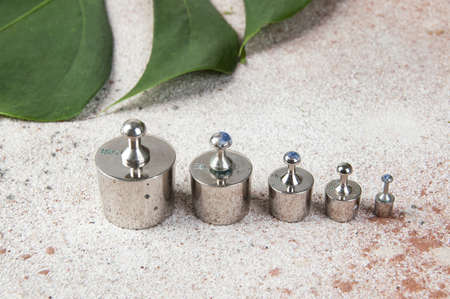 Set of metal weights for scales and the calibration test. Weight set for calibration balance to accuracy and precision. Apothecary, pharmacist, scientist. Physics.