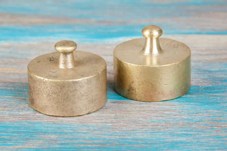 Two antique bronze weights for scales on blue wooden background. Copy space for text and food photography props.