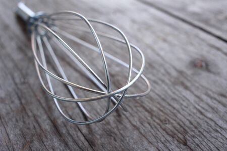 Old vintage steel wire whisk on a rustic wooden kitchen table in a close up view to the end