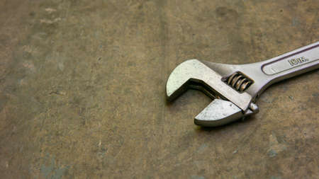 A metal adjustable wrench or spanner on isolated floor background. It is a tool used to provide grip and mechanical advantage in applying torque to turn objects. Selective focus on object.