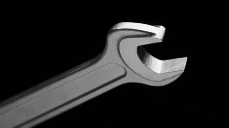 Close up of a wrench on a blue background. Shallow depth of field