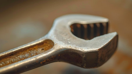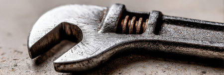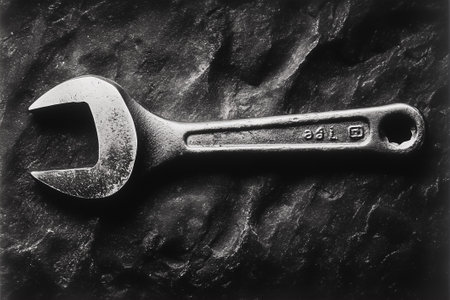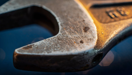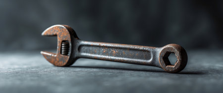 AI Generated. Close up of a rustic metal wrench on dark surface