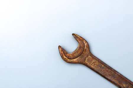 old rusty spanner on clean grey background with copy space.