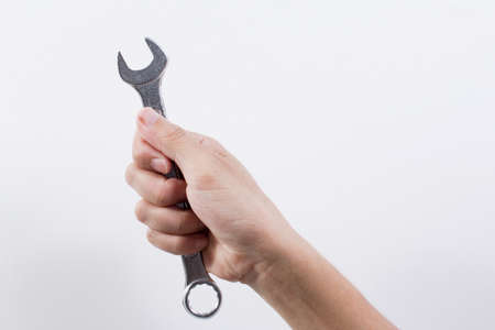 male hand holding wrench on white background