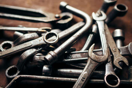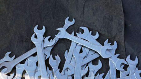 Set of spanner on old abandoned iron plate. - industrial workshop hand tools concept.