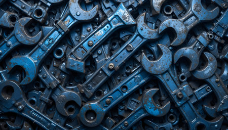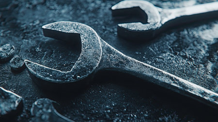 A close-up view of vintage wrenches resting on a rough textured surface. The image emphasizes the industrial aesthetics and intricate details of these essential tools.
