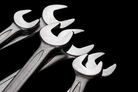 Steel wrenches isolated on black background closeup. Beautiful photo for a poster in a car workshop. Selective focus