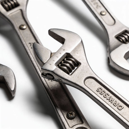 A detailed view of a silver adjustable wrench showing signs of use, positioned on a metal workbench with subtle textures and tones.