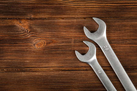 Metal wrenches on wood background