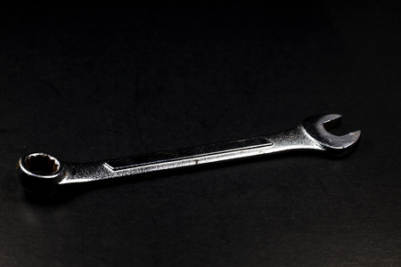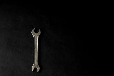 Metallic Wrench tool of mechanic to tighten the nut and bolts. Isolated in black background paper with selective focus.