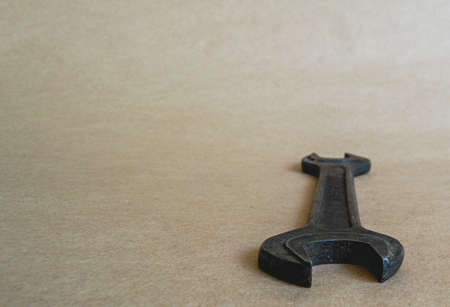 Old rusty metal spanner on brown paper background. Copy space.