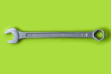 Steel tool close-up. Wrench on a green background.