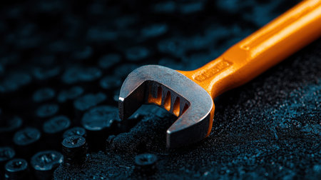 A wrench is shown on a black surface with a blue background. The wrench is orange and has a black handle