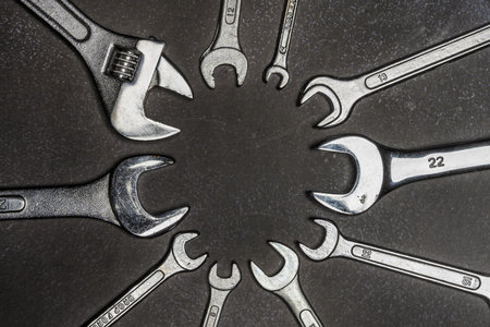 Set of spanners and wrenches on dark background