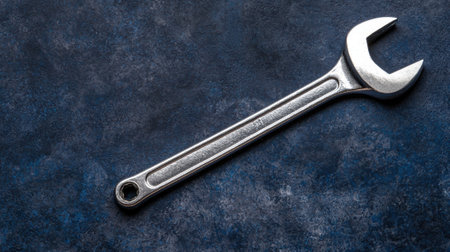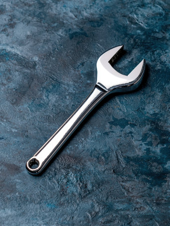Shiny wrench on a textured blue surface.