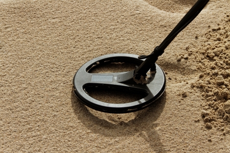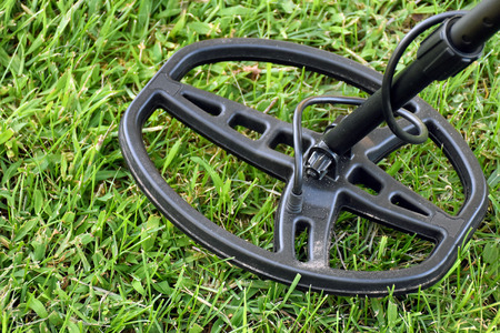 Metal electronic detector coil, looking for treasure, searching coins in ground