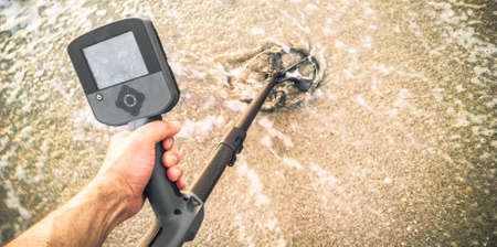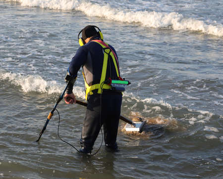 A man with a special device and equipment metal detector looking for lost jewelry and gold in sea water near the beach.