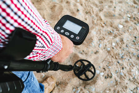 Man using electronic metal detector devic on sea sand beach. Detecting hobby.
