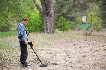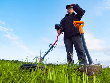 Young guy with a metal detector. He is looking for a treasure. A man with a metal finder. A person uses a metal detector to find something. Concept - he looks for the location of pipes underground.