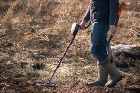 Man with electronic metal detector device working on outdoors. Close-up photography of searching antiques process.