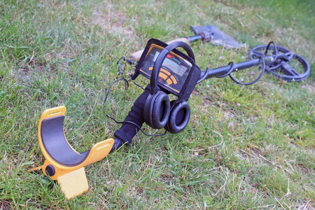 Metal detector laying outdoors on the grass. Close up electronic treasure finder.