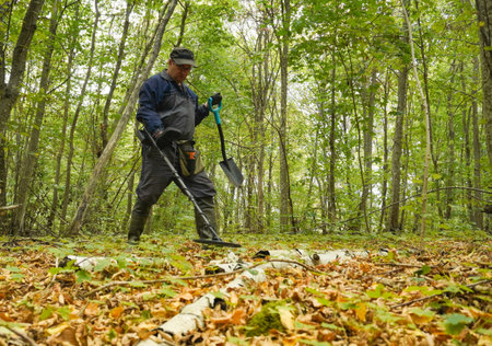 A person is searching for buried treasures in a forest filled with green trees and fallen leaves. They are using a metal detector and a shovel, focused on their task during the autumn season.
