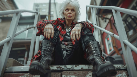 Elderly woman in plaid jacket and black combat boots portrait image, ai generated. Tough confident female senior sits on outdoor stairs picture photorealistic. Punk rock style concept photo realistic