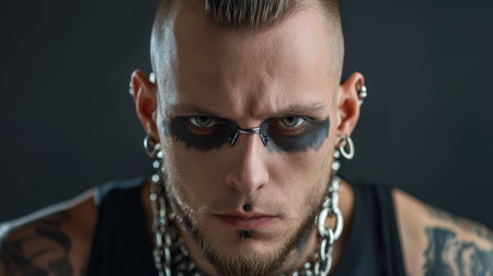 A man with a shaved head and tattoos on his arm is wearing a black tank top and a chain necklace. He has black eye makeup and a black nose ring. The man's expression is angry