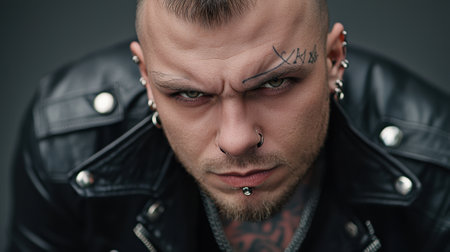 A man with a shaved head and tattoos on his face is wearing a leather jacket. He has a piercing in his nose and a tattoo on his arm. He is looking at the camera with a scowl on his face