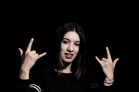 woman putting horns with her hands with black background