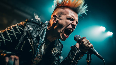 Punk rocker screaming into mic mohawk and leather stage rebellion